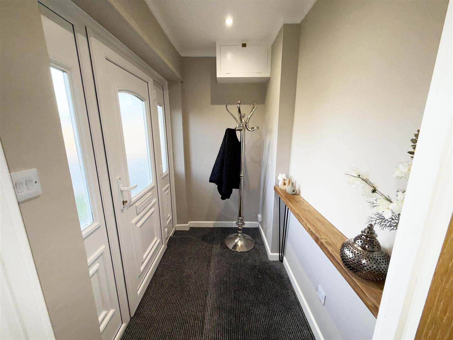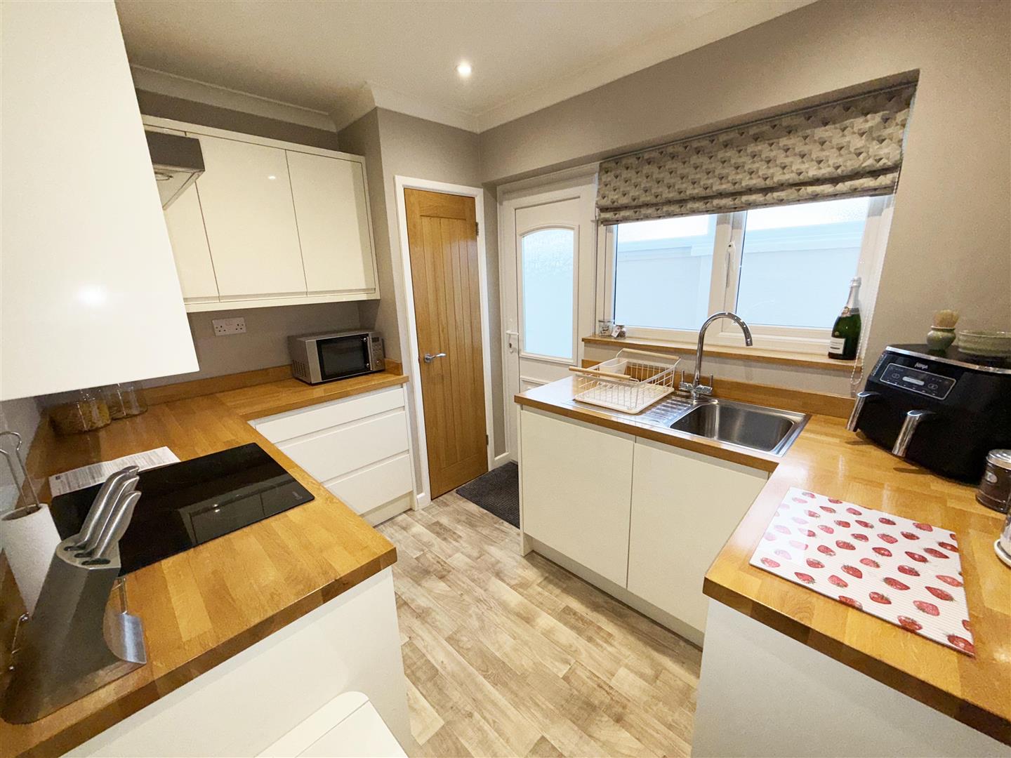 Fitted with a matching range of wall, base & drawer units with work surfaces over & stainless steel sink & drainer unit inset. Integrated oven, integrated hob with stainless steel chimney style extractor over. Integrated fridge. Built in pantry. Double glazed door to the lobby.