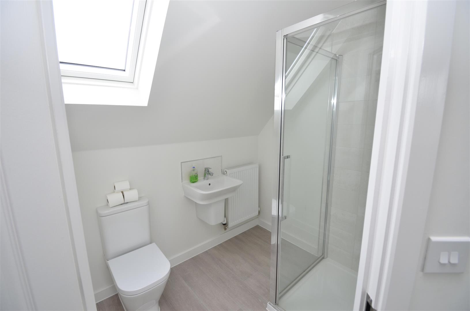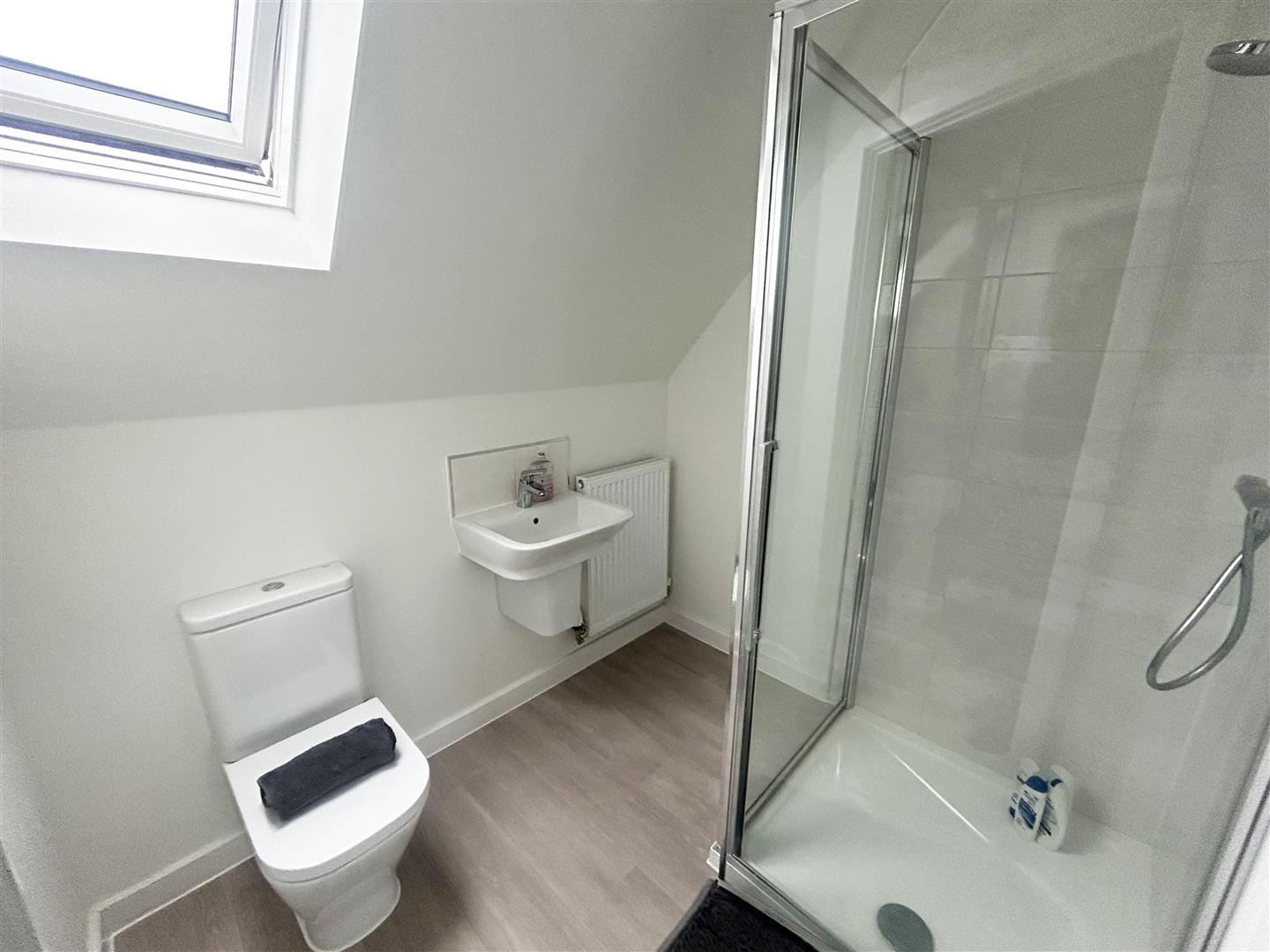 Double glazed Velux window to rear aspect. Fitted with a white three piece suite comprising shower cubicle with shower over, W.C and wash hand basin with tiled splashback. Partially tiled walls, tile effect flooring, radiator.