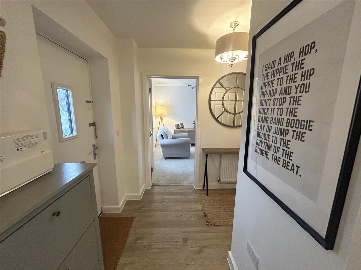 Stairs rising to first floor. Radiator, wood effect flooring, doors to the cloakroom, living room and kitchen/ diner/ family room.
