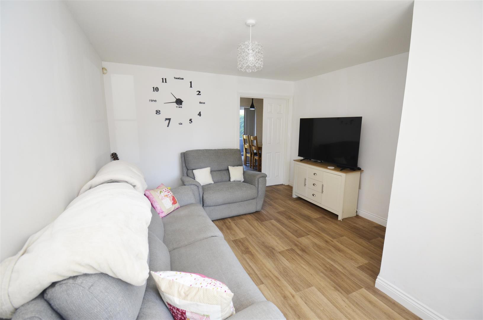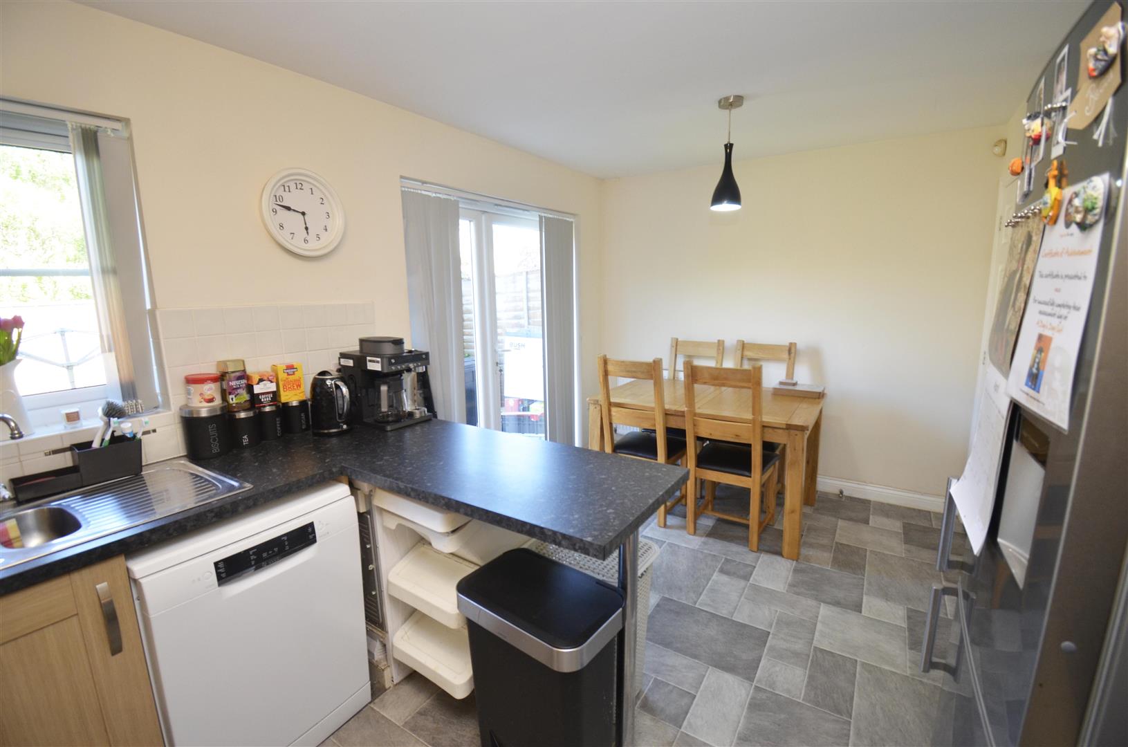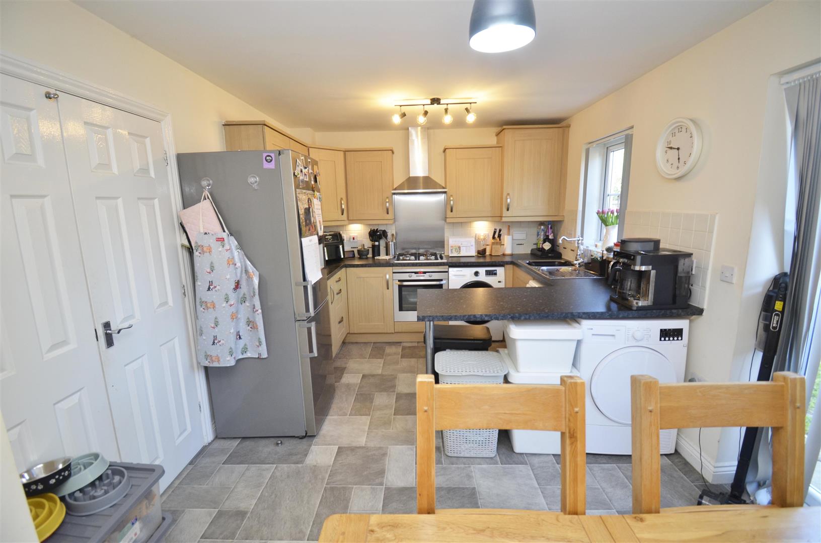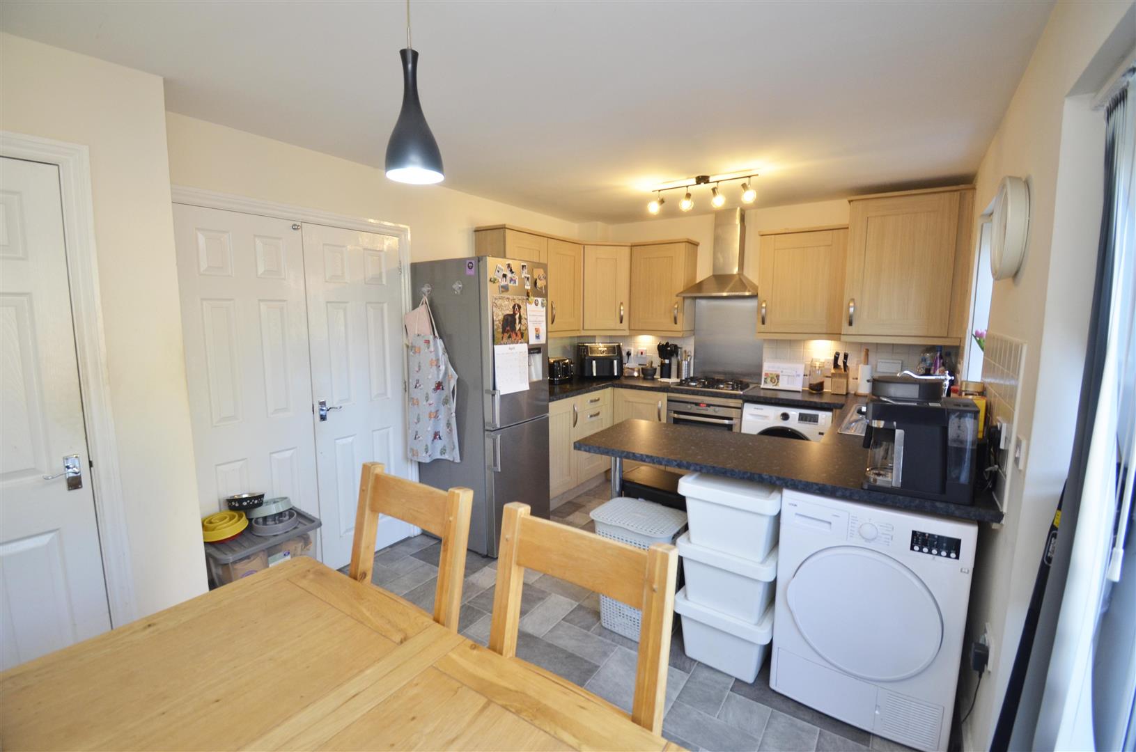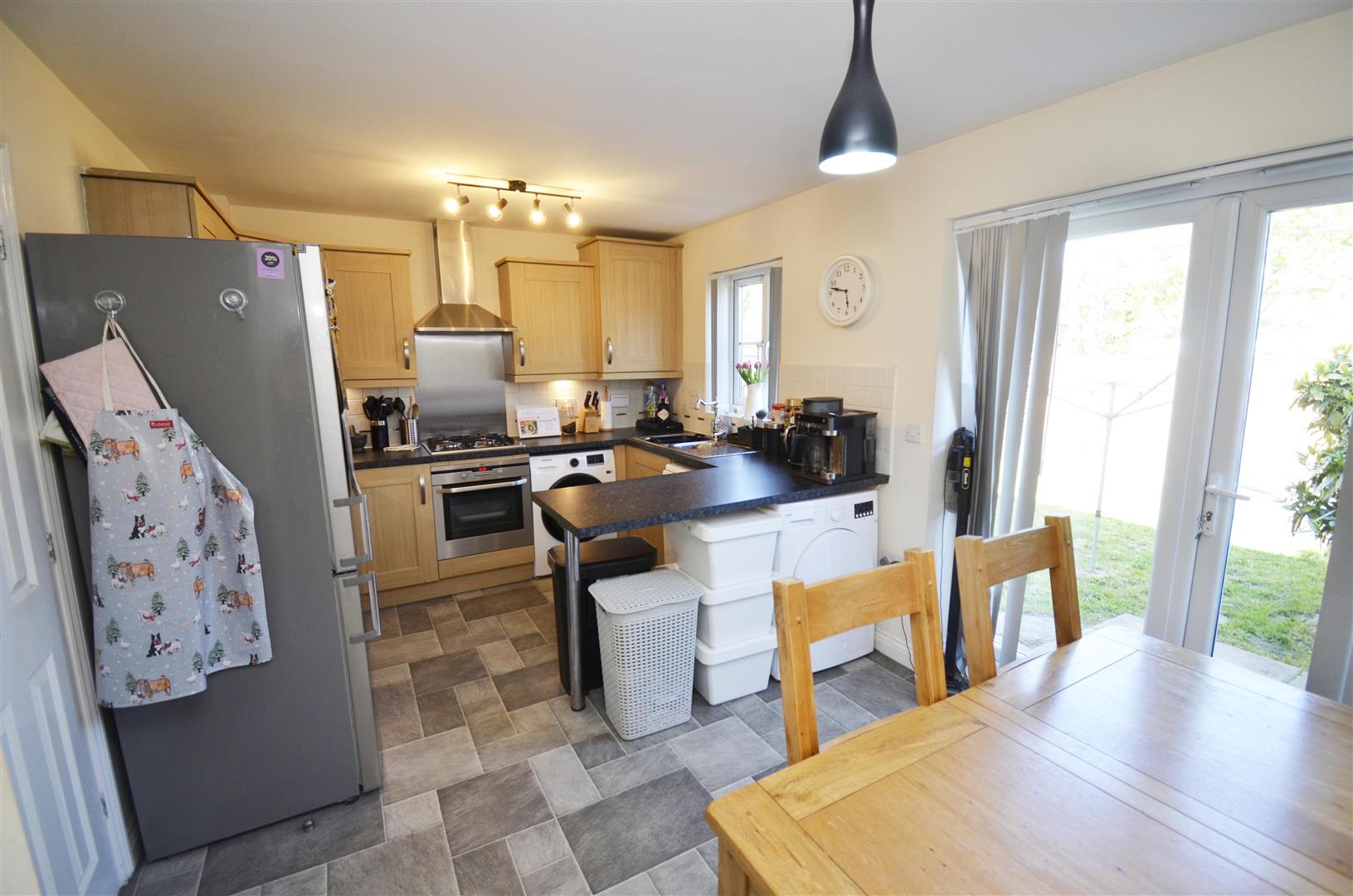 Rear aspect double glazed window. Fitted with a range of wall, base and drawer units with roll top work surfaces over with stainless steel sink and drainer unit inset. Boiler concealed in cupboard. Built in appliances to remain including electric oven and gas hob with stainless steel splashback and chimney style extractor hood over. Space for fridge/ freezer and dishwasher, space and plumbing for washing machine, space for a tumble dryer. Built in cupboard. Double glazed French doors to garden.