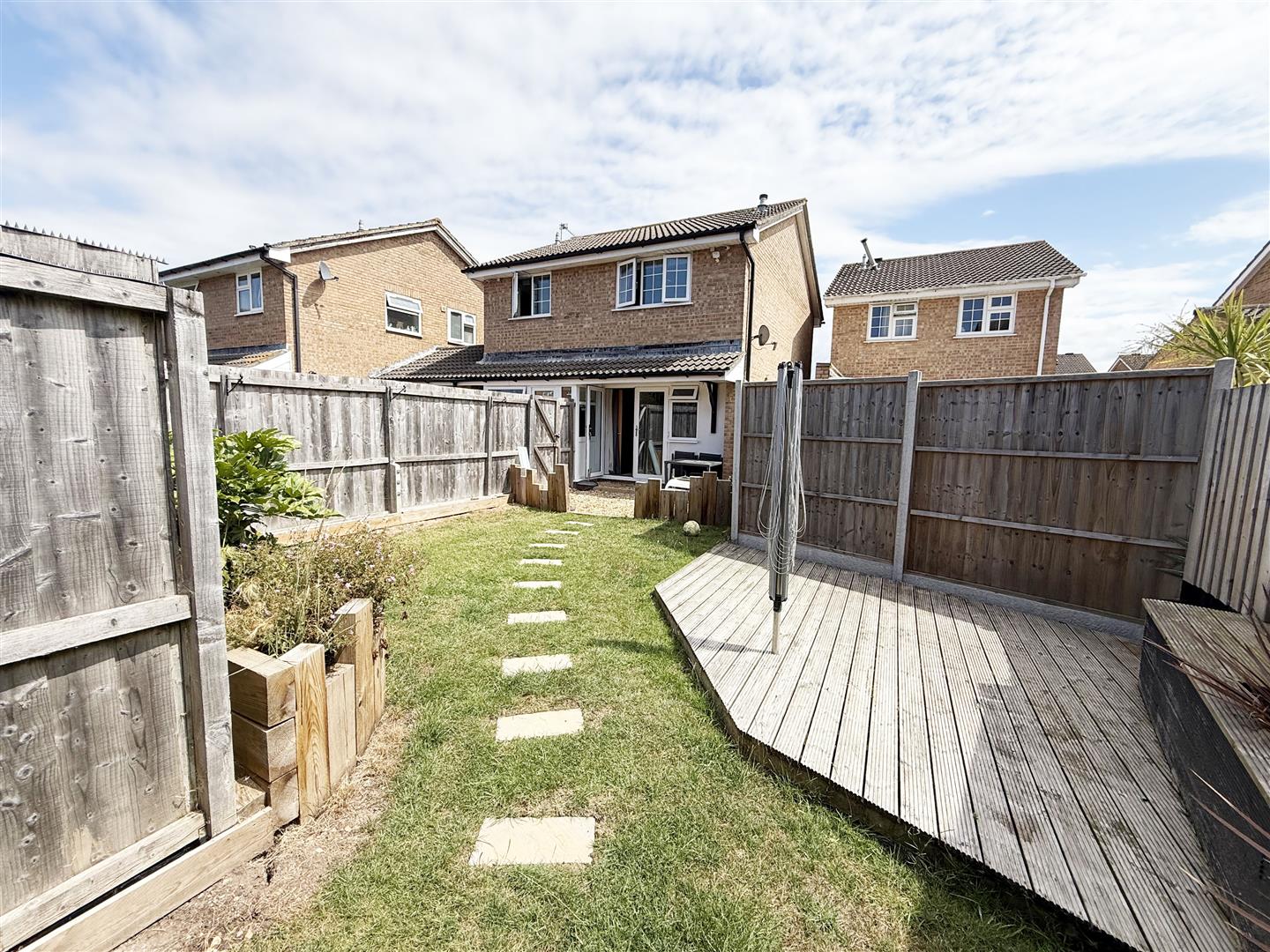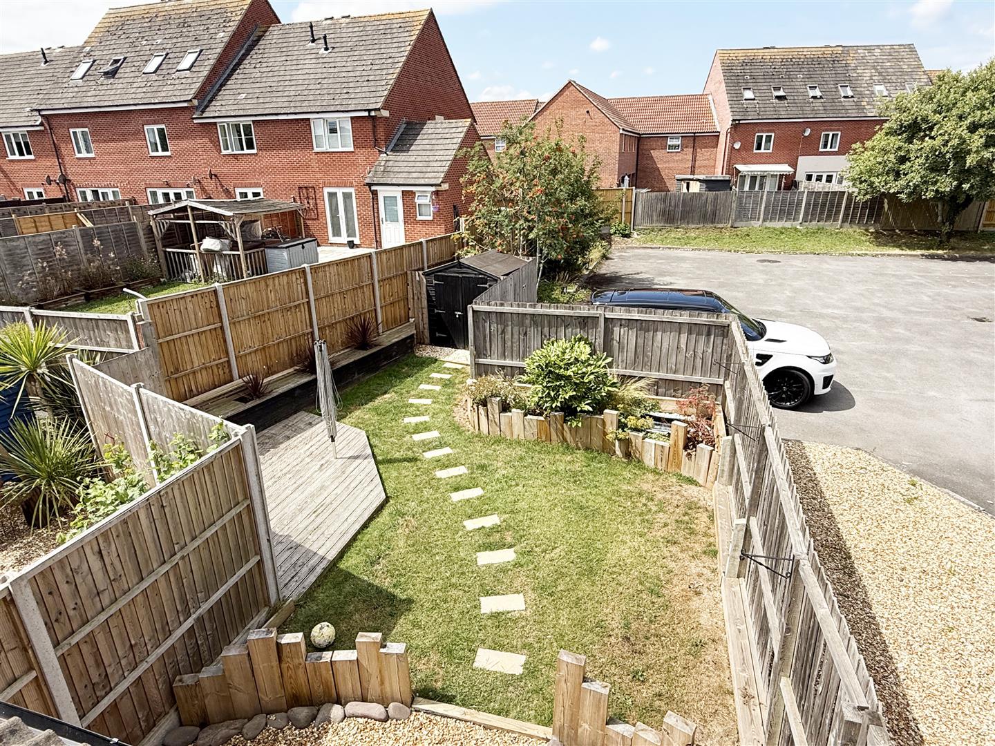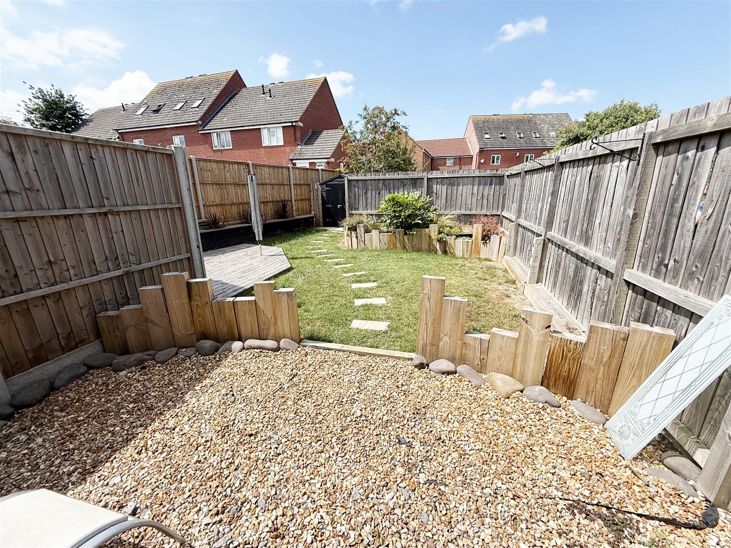Enclosed, predominantly by panelled fencing, shingled area adjoined to property with built in shed. Predominantly laid to lawn with flower & shrub borders. Decked area with further shed.