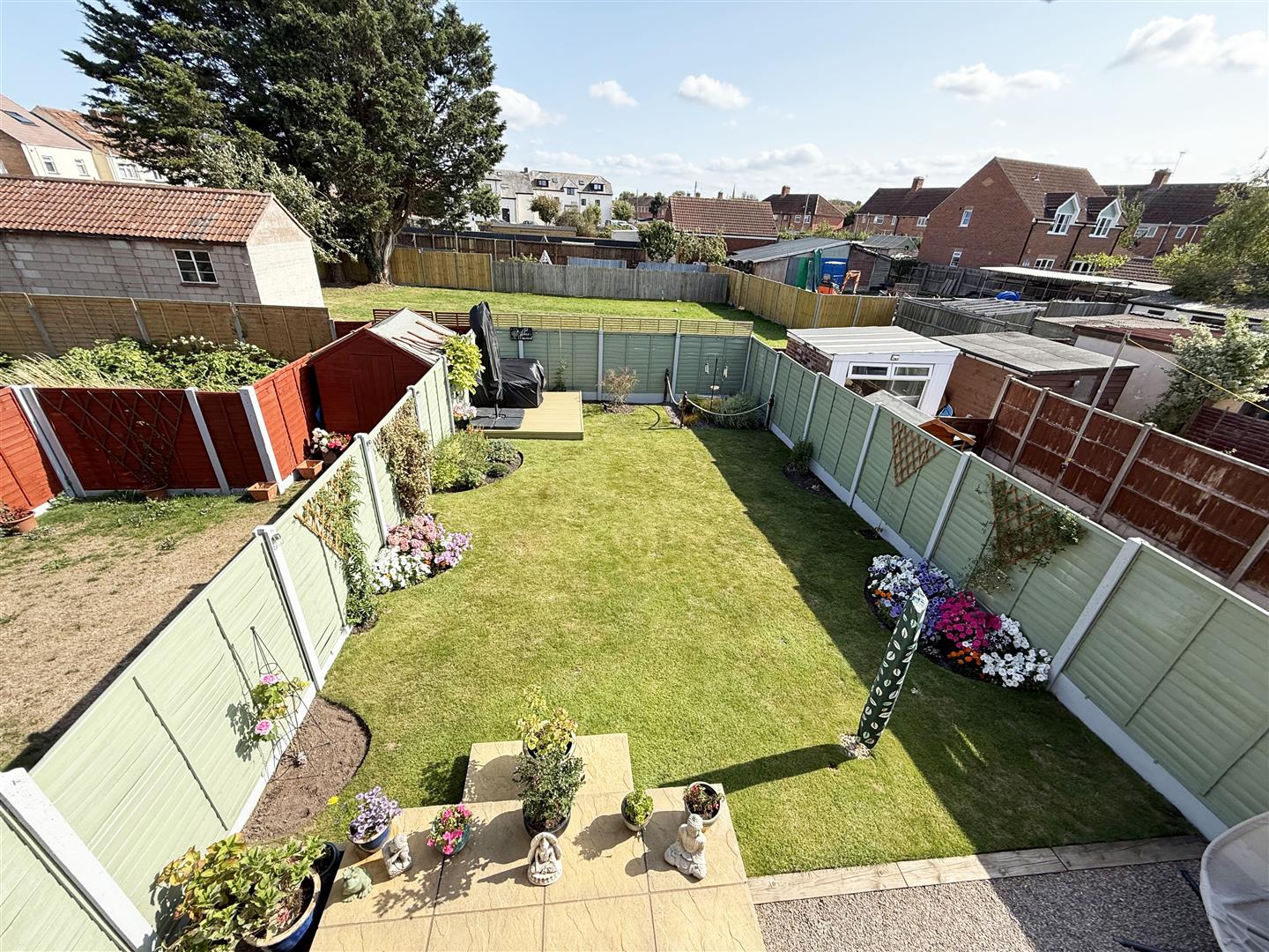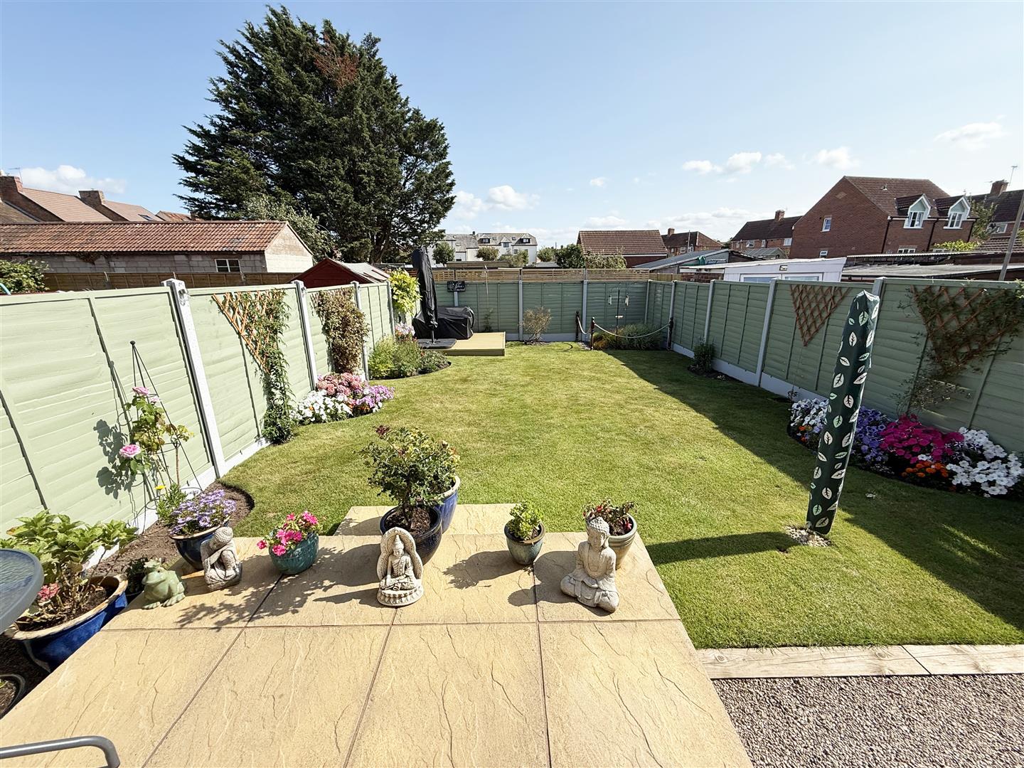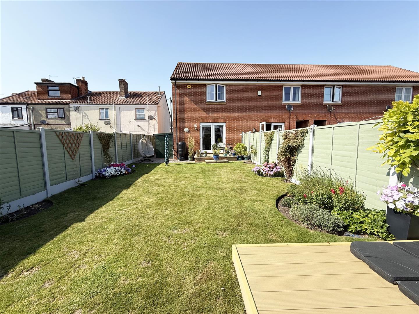Fully enclosed by panel fencing. Mainly laid to lawn with composite decking to rear. Pedestrian side access leading to parking and front of property.
