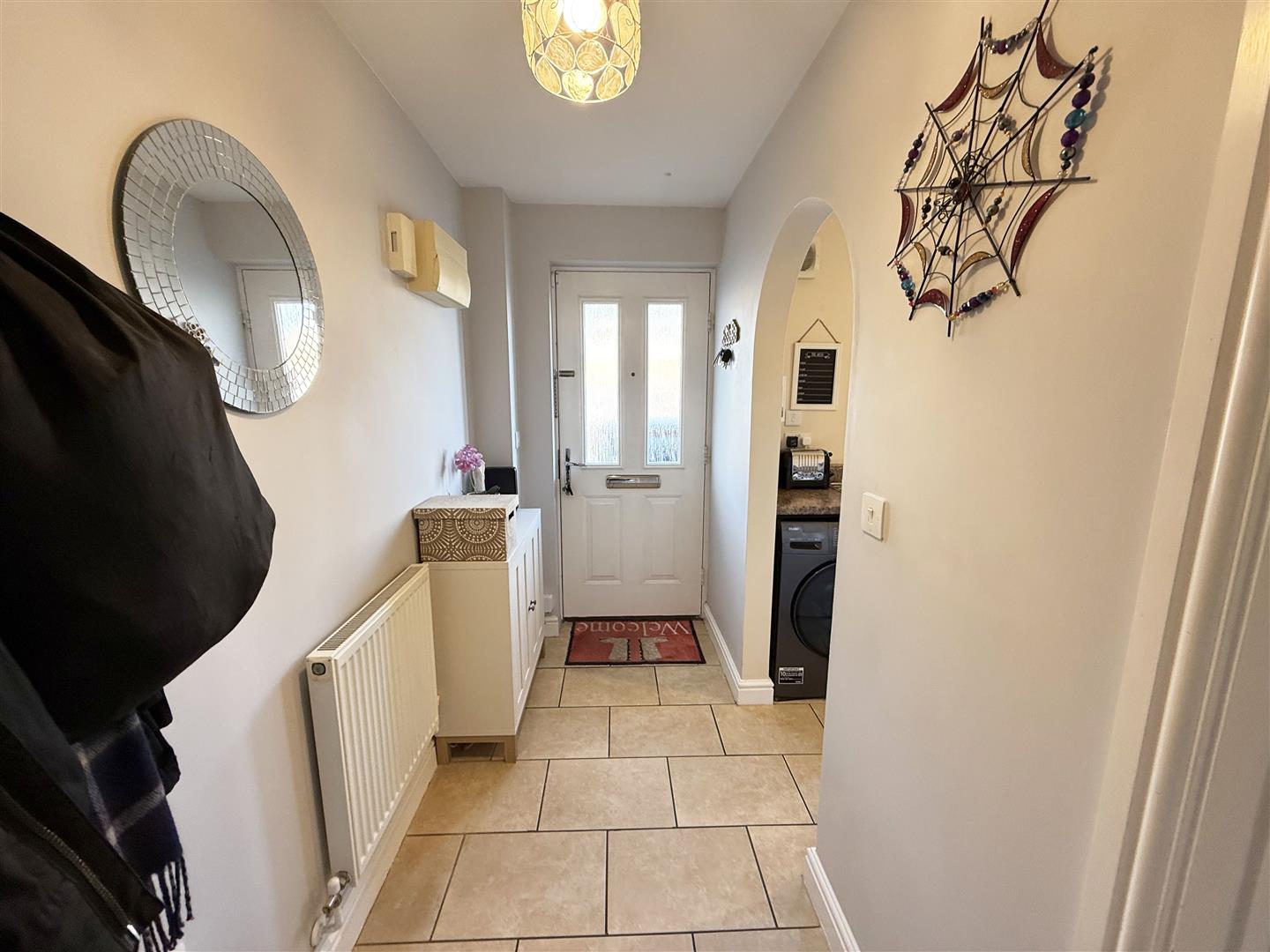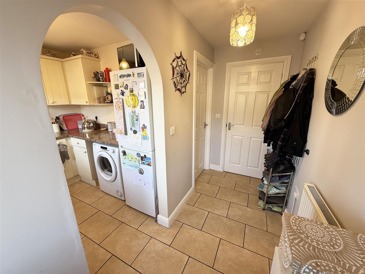 Radiator, tiled floor. Doors to cloakroom and living room and opening to: