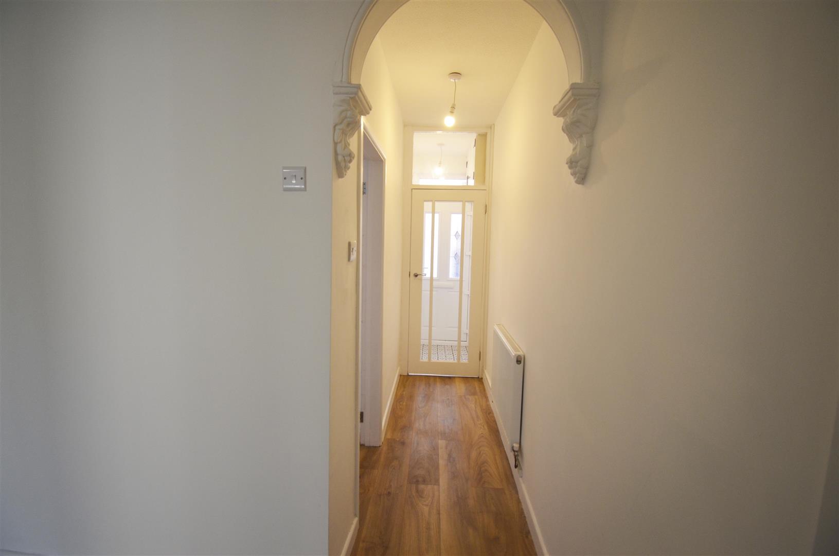 Wood effect flooring, radiator, door to living room and opening to the dining room.