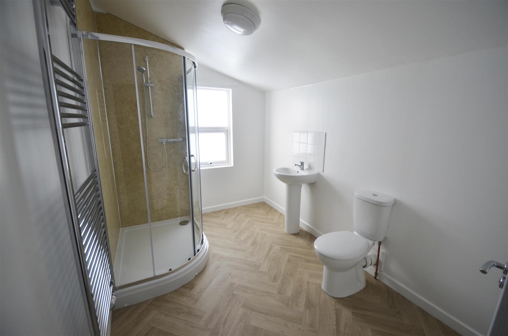 Obscure rear aspect double glazed window. Fitted with a three-piece white suite comprising corner shower cubicle with wall mounted shower over, pedestal wash hand basin and close coupled WC with push button flush. Heated towel rail.