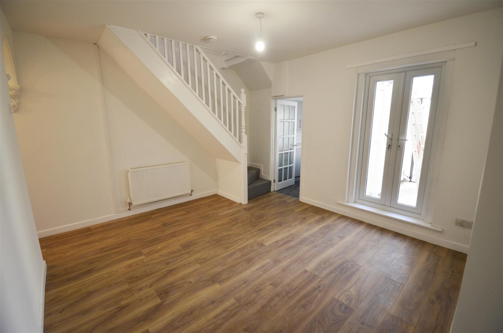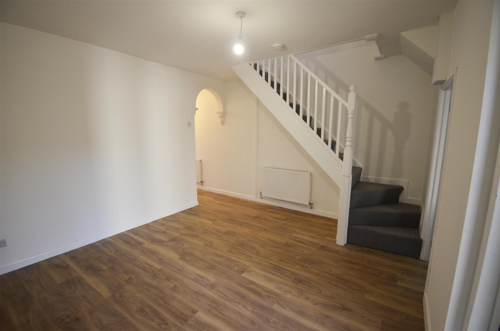 Staircase to first floor. Wood effect flooring, radiator, double glazed French doors to the garden. Door to kitchen.