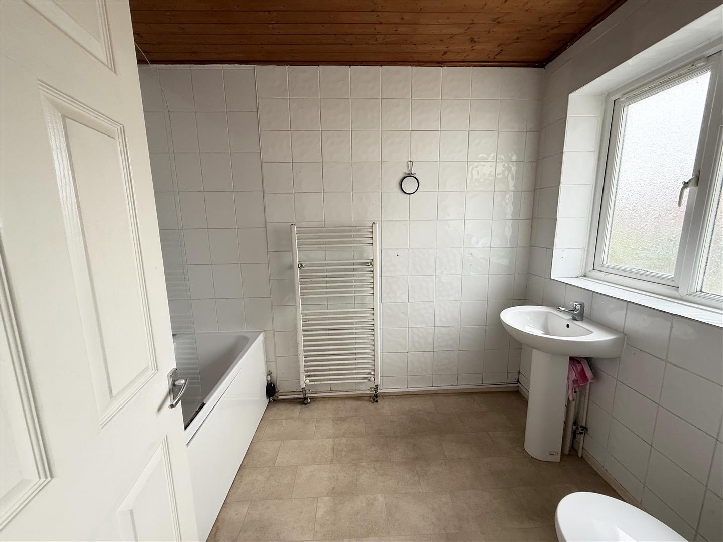 Obscure side aspect double glazed window. Fitted with a three piece white suite comprising panelled bath with chrome telephone style tap with shower attachment, pedestal wash hand basin and low level WC. Tiled walls, heated towel rail.