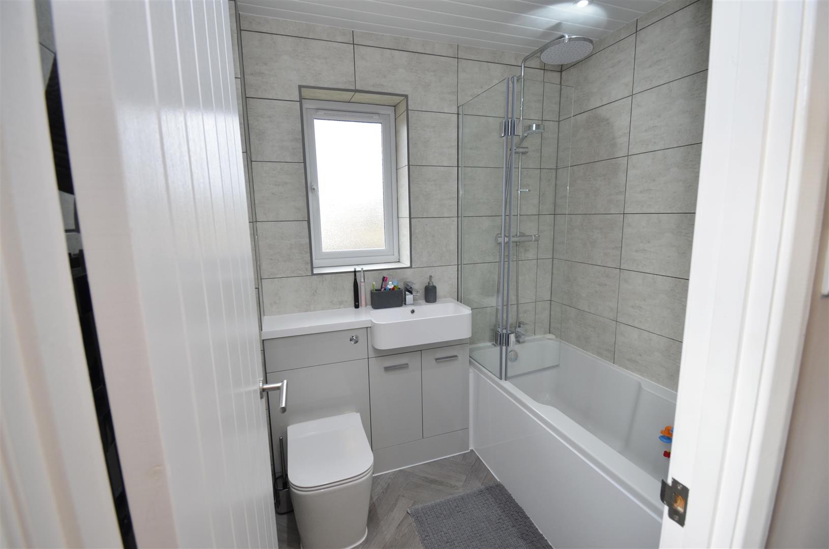 Obscure rear aspect double glazed window. Fitted with a matching three piece suite comprising panelled bath with shower over and glass screen, vanity wash hand basin and WC. Tiled walls, radiator.