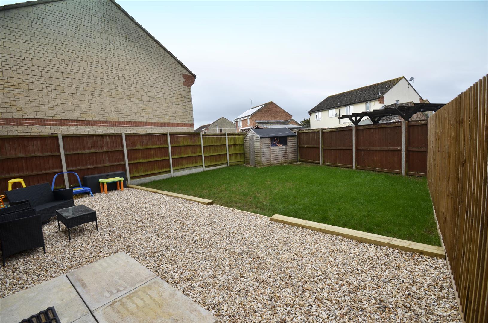 Fully enclosed with timber fencing. Mainly laid to lawn. Timber shed to remain.