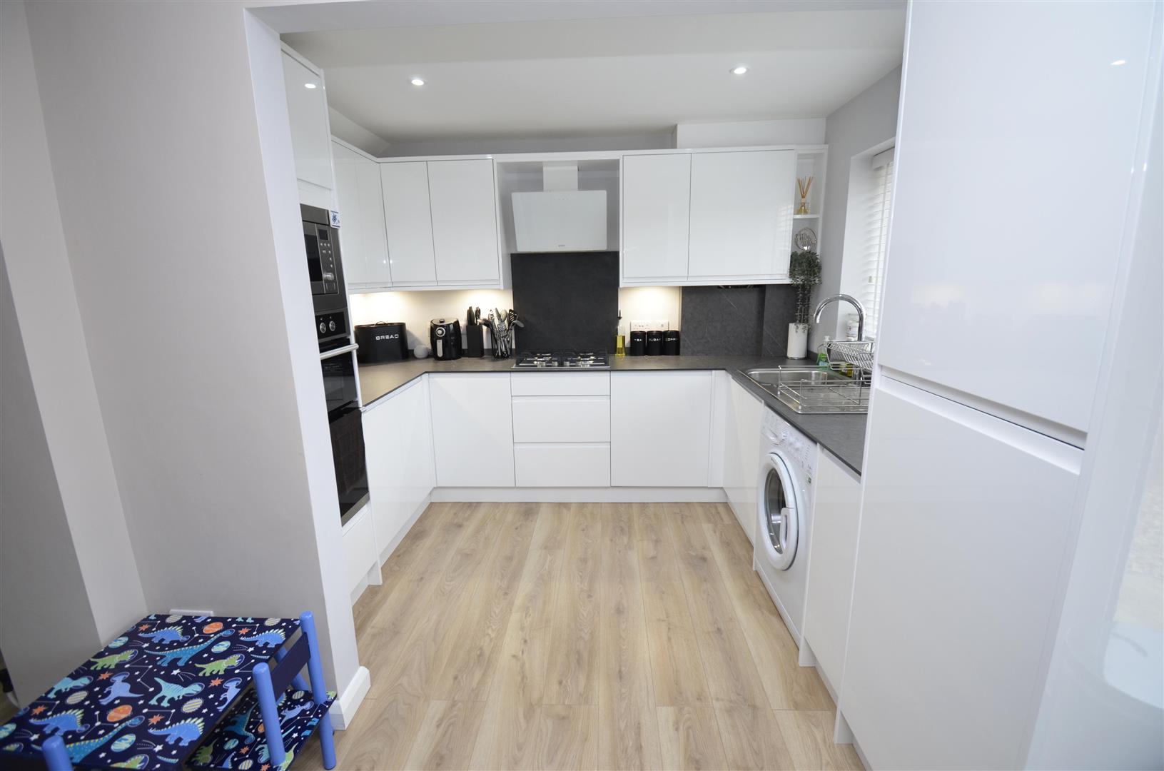 Rear aspect double glazed window. Fitted with a matching range of wall, base and drawer units with work surfaces over and stainless steel sink and drainer unit inset. Integrated oven, grill and microwave. Integrated gas hob with splashback and extractor. Integrated fridge/ freezer, space and plumbing for a washing machine and integrated dishwasher. Splashbacks, wall mounted boiler concealed in cupboard. Radiator.