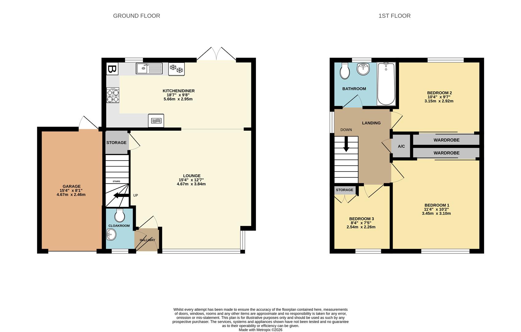 Accessed via up and over door, power and light connected, over head storage, personnel door leading to rear garden.