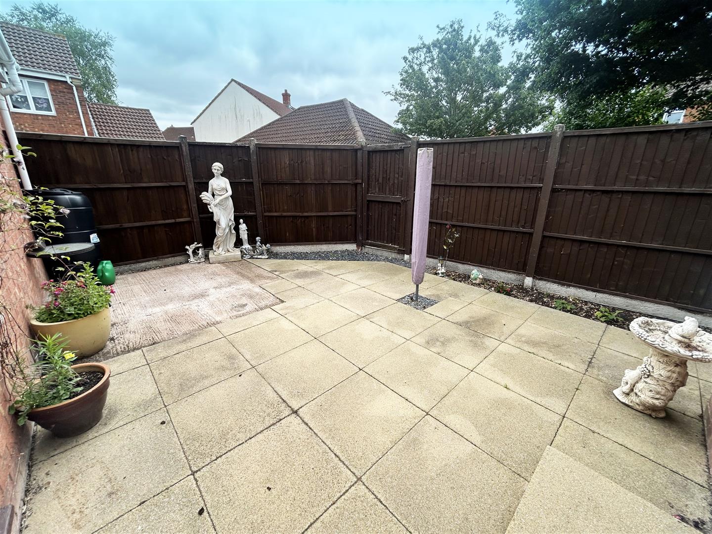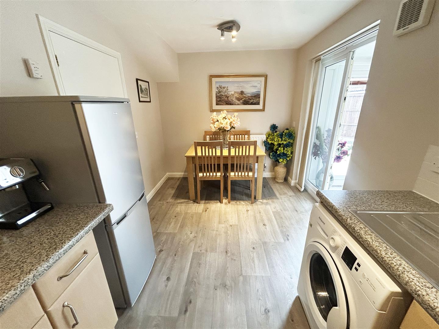 Rear aspect double glazed window. Fitted with matching wall, base and drawer units and roll top work surfaces over with stainless steel sink and drainer unit inset. Built in appliances to remain including electric oven and four ring hob with extractor fan over. Space for fridge freezer and space and plumbing for washing machine. Gas fired boiler concealed in wall unit. Radiator. Wood effect flooring. Double glazed French doors to: