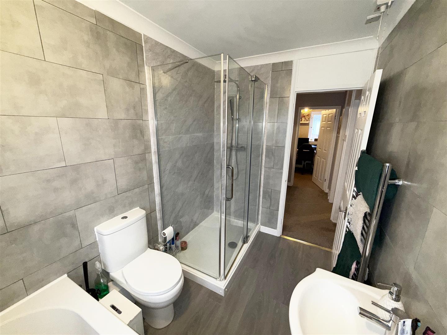 Rear aspect obscure double glazed window. Refitted with a contemporary four piece suite comprising large walk-in shower, bath, vanity wash hand basin and close coupled WC with push button flush. Colour co-ordinated floor and walls, heated towel rail.