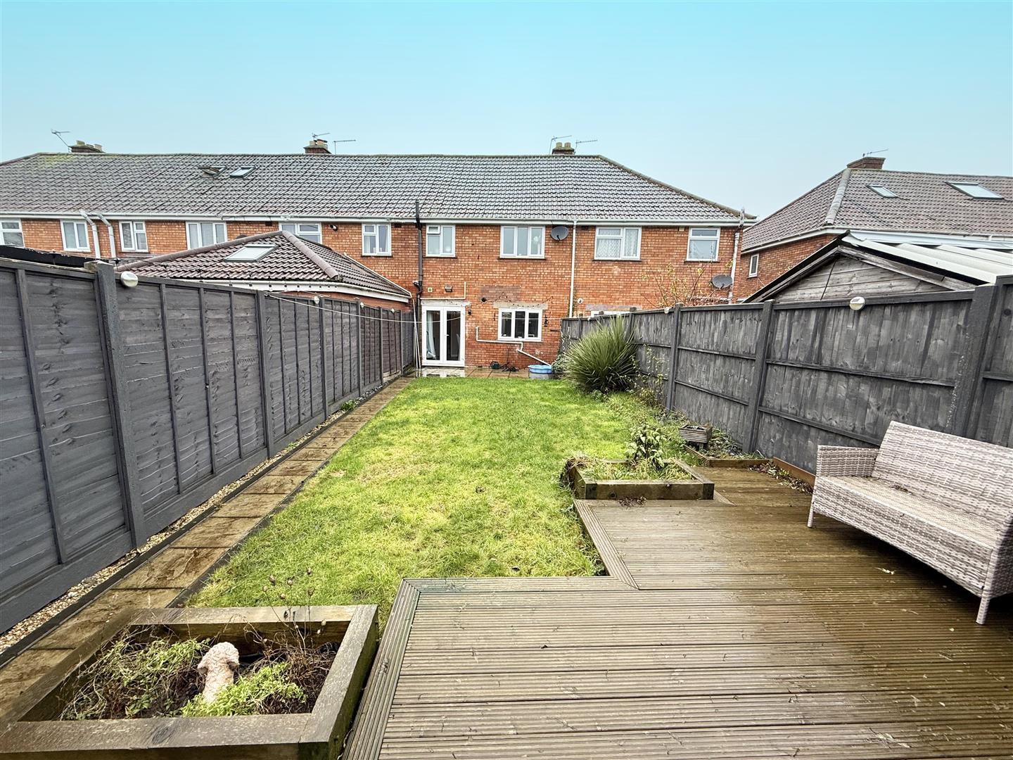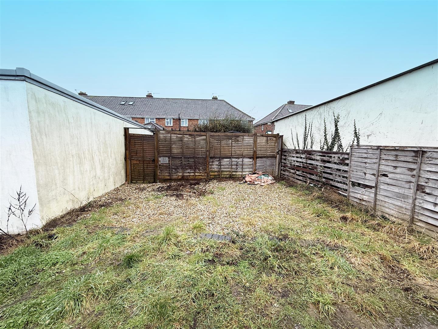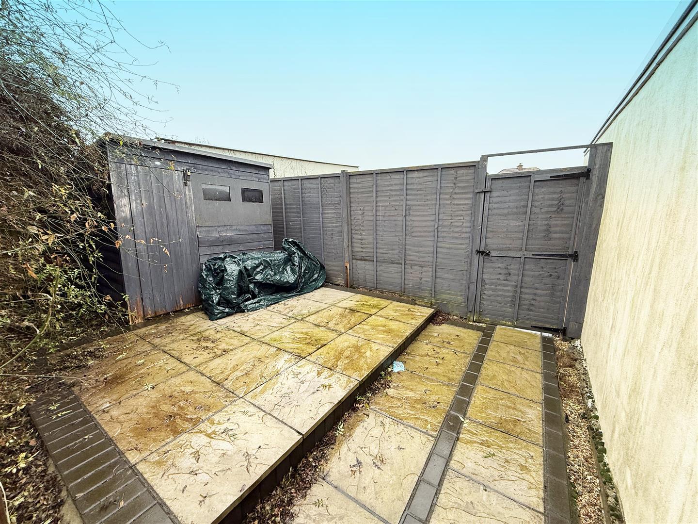 Mainly laid to lawn with patio adjacent to property and to rear. Shed on hardstanding to remain. Rear gate leading to parking.
