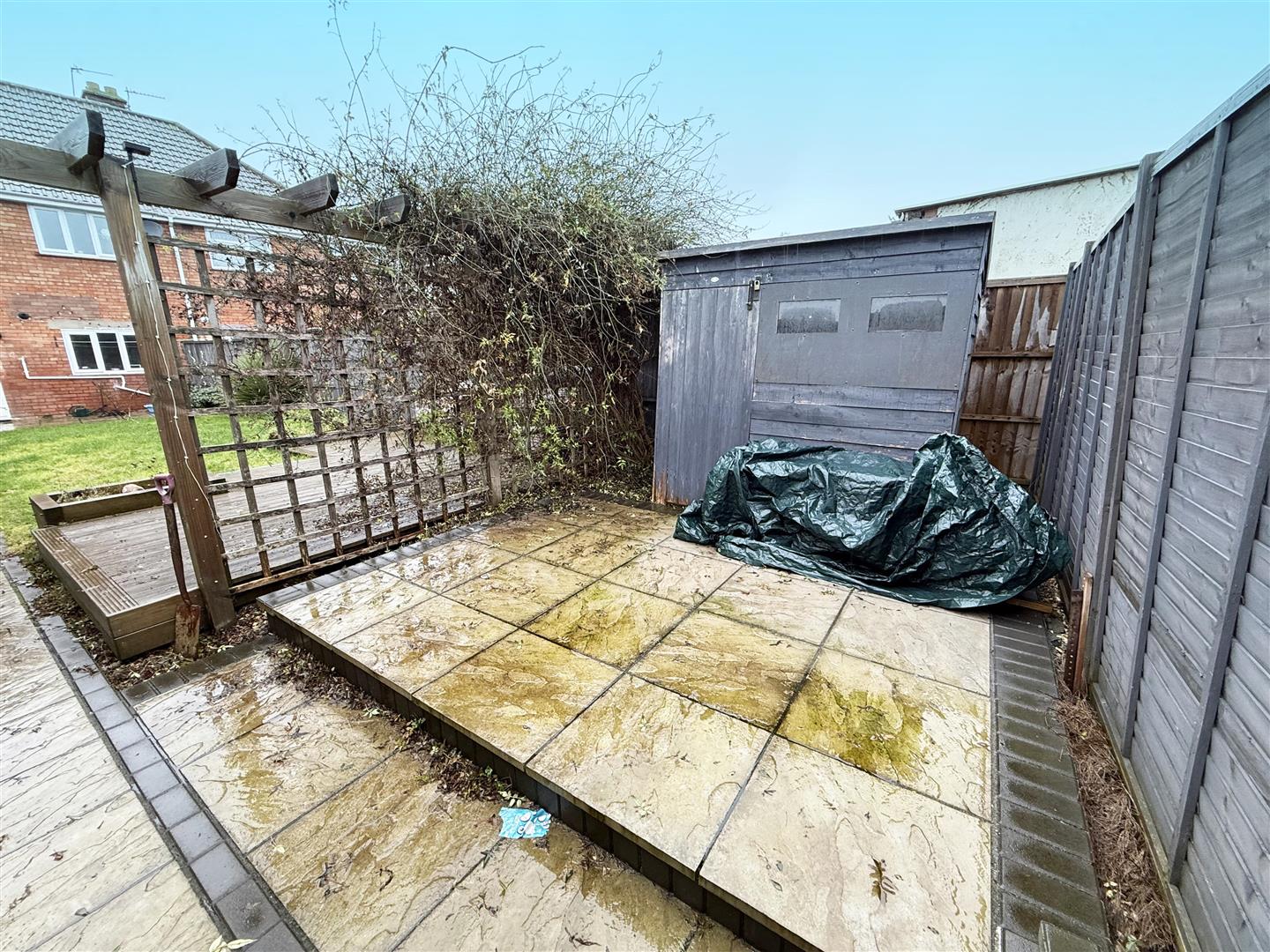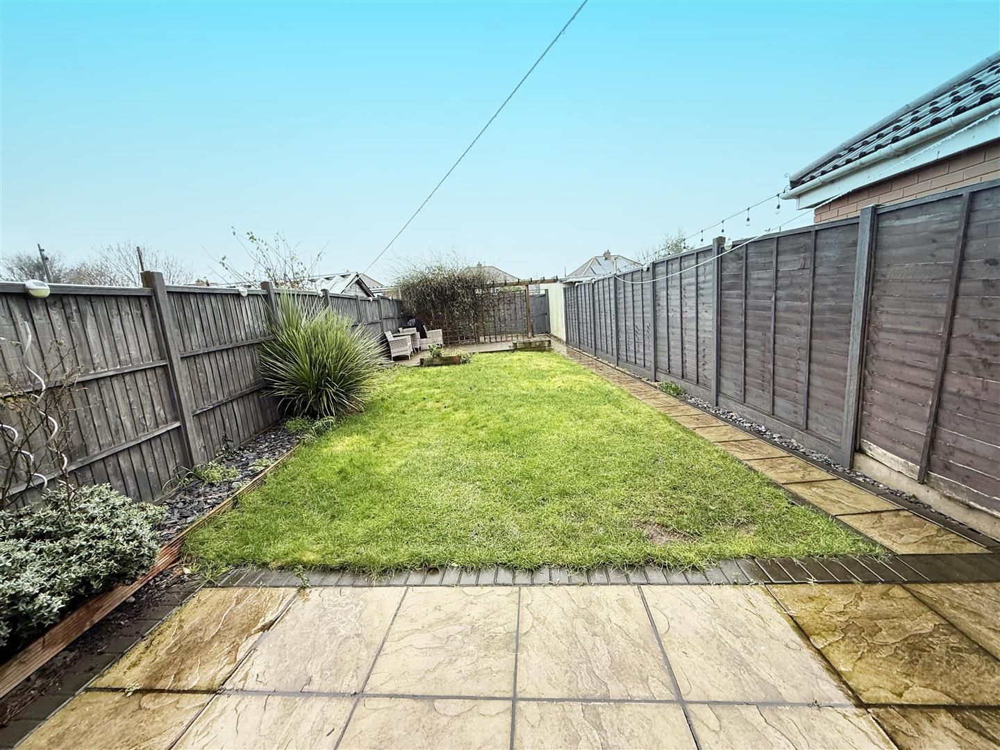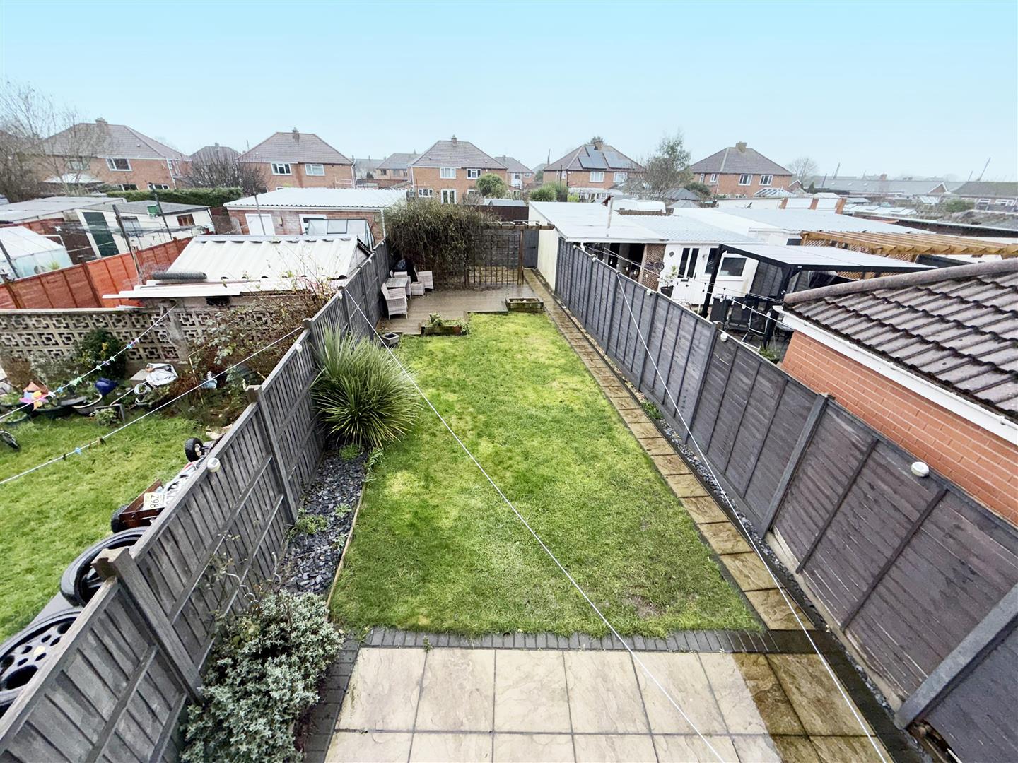 Mainly laid to lawn with patio adjacent to property and to rear. Shed on hardstanding to remain. Rear gate leading to parking.