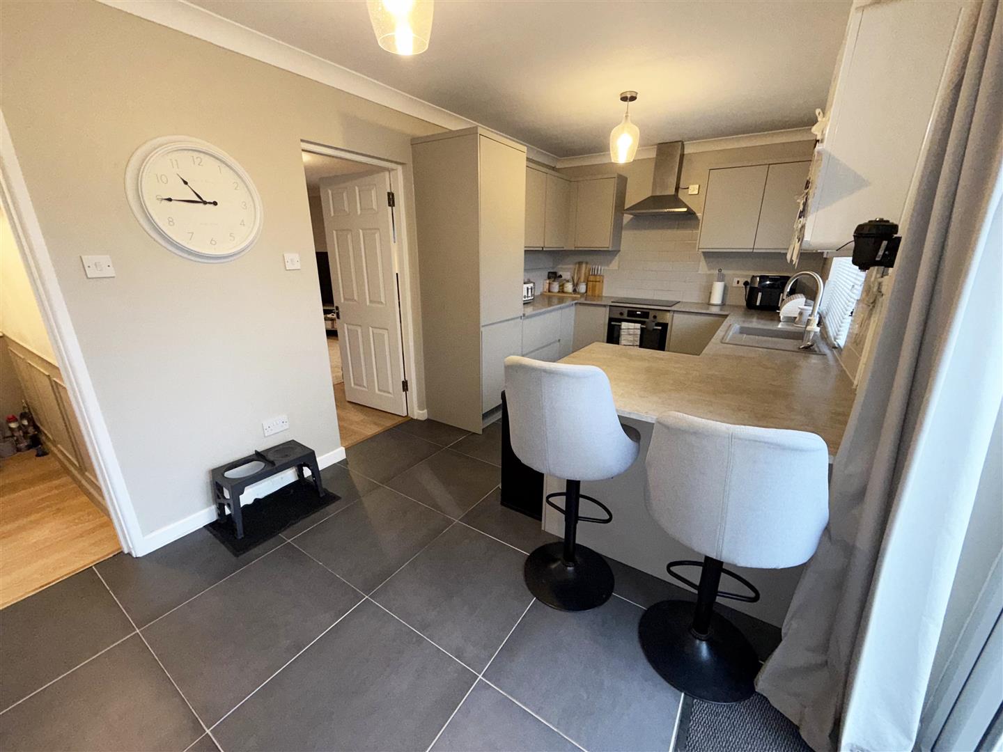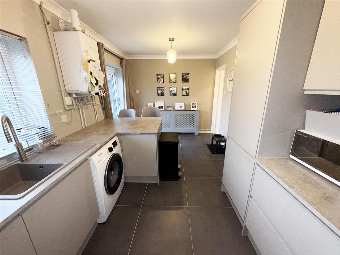 Rear aspect double glazed window. Fitted with a vast range of grey wall, drawer and base units with work surfaces over and sink and drainer unit inset. Built in dishwasher and fridge/ freezer to remain. Integrated cooker & hob with stainless steel chimney style extractor over. Tiled splashbacks. Space and plumbing for a washing machine. Radiator, tiled floor. Boiler mounted on the wall (installed in 2022) Door to WC, Double glazed French doors opening onto the garden.