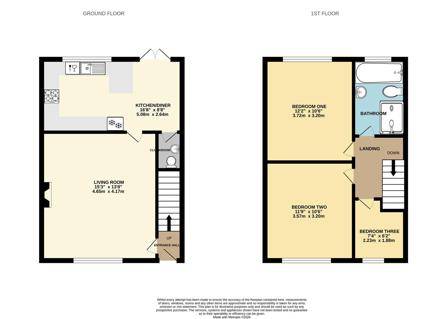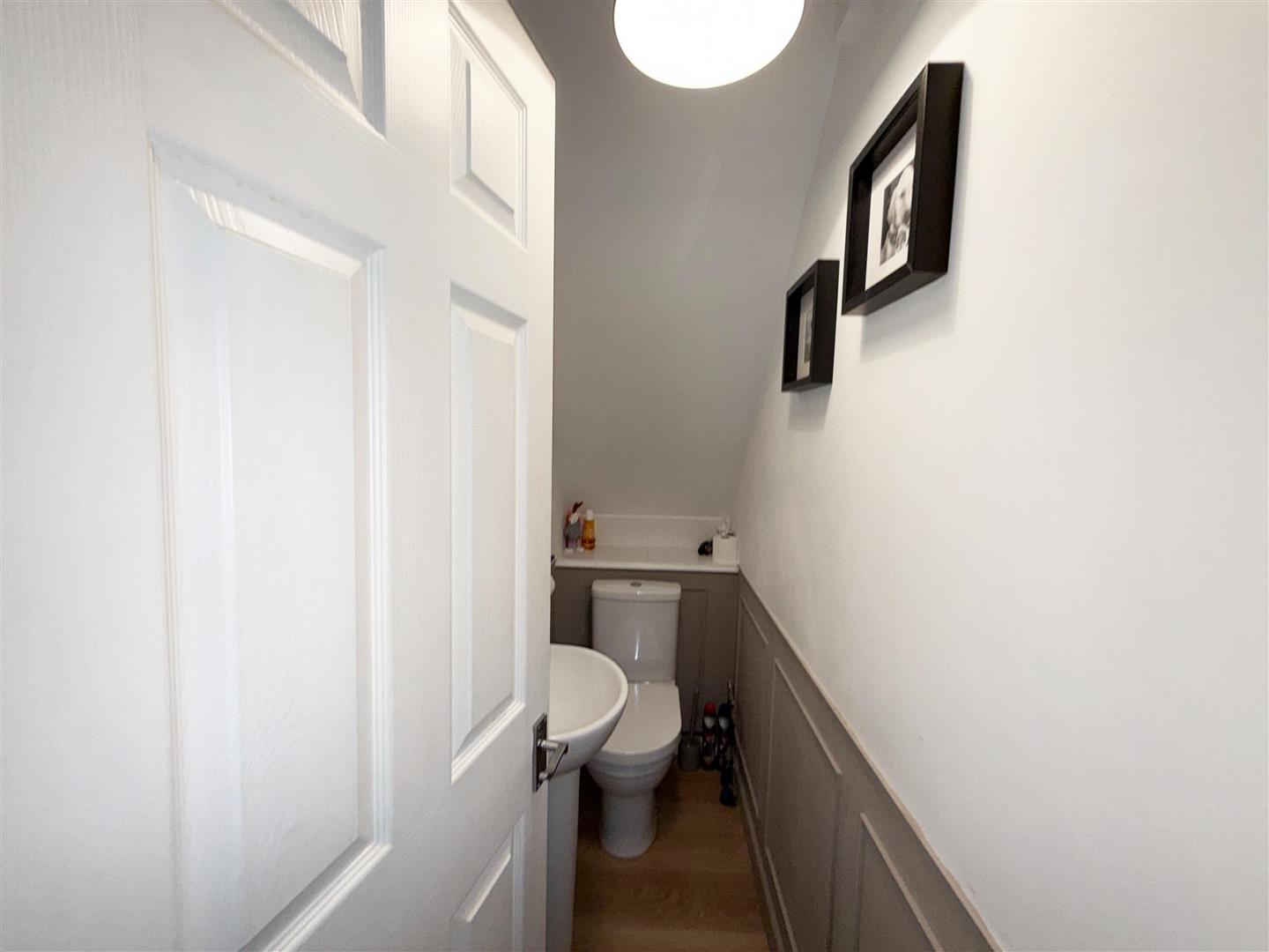 Fitted with a two piece suite comprising a close coupled WC with push button flush and wash hand basin. Part panelled walls, wood effect flooring.