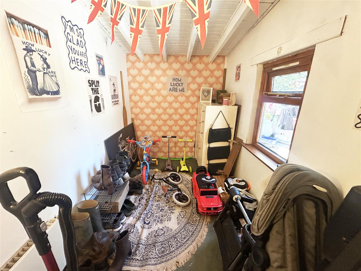 Rear aspect window. Space and plumbing for a washing machine. Timber door to the garden.