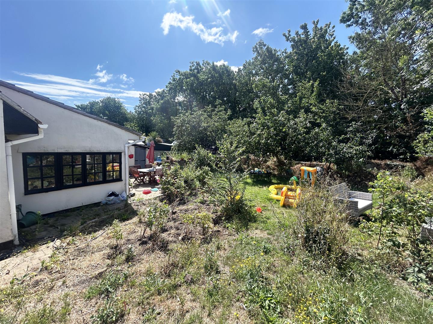 Fully enclosed and mainly laid to lawn with mature shrubs, fruit trees, patio area, pond and storage shed. Timber gate to the front of the property.