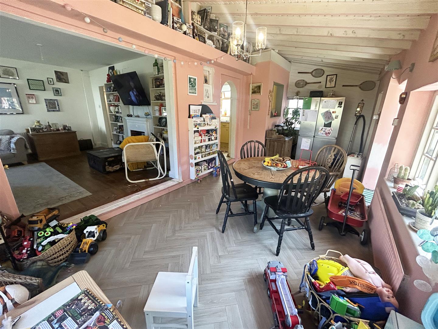 Side aspect double glazed window. Fitted with a matching range of wall, base and drawer units with roll top work surfaces over and stainless steel circular sink inset. Integrated appliances to remain including oven, grill and hob. Tiled splash backs and painted floorboards, opening to the dining room.