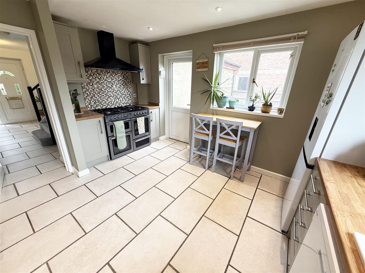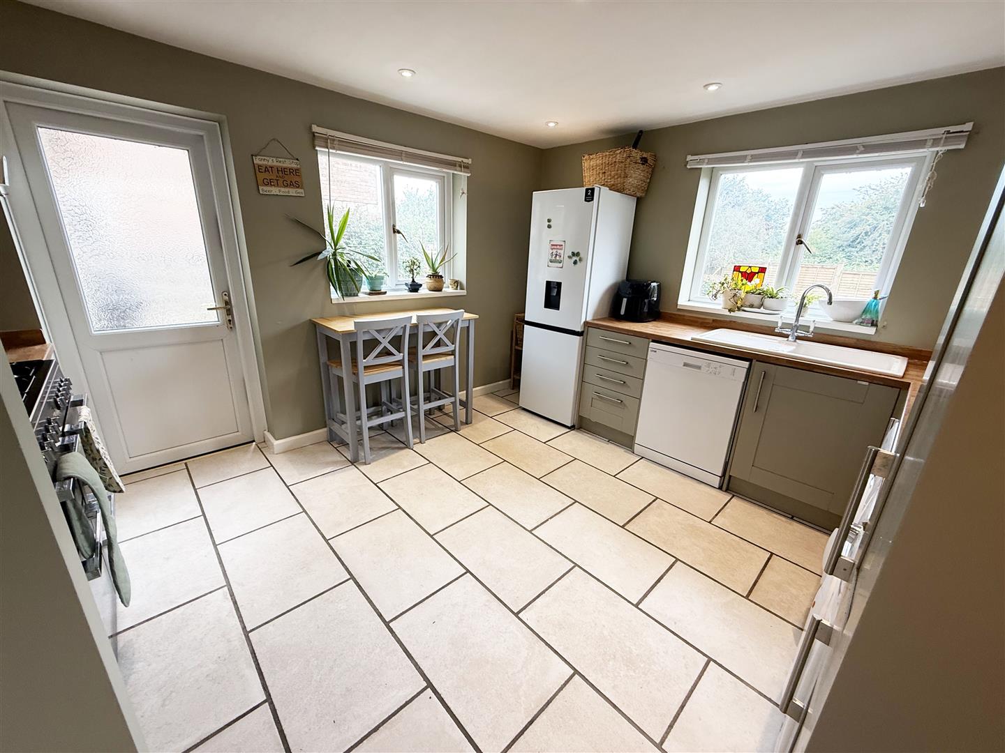 Dual aspect double glazed windows. Fitted with a range of sage wall, base & drawer units with worksurfaces over with ceramic sink and drainer unit inset. Freestanding cooker with stainless steel chimney style extractor fan over. Space for fridge/ freezer, space and plumbing for a washing machine, space for dishwasher, space for tumble dryer. Wall mounted gas fired boiler. Tiled flooring. Double glazed door to the garden. Door to: