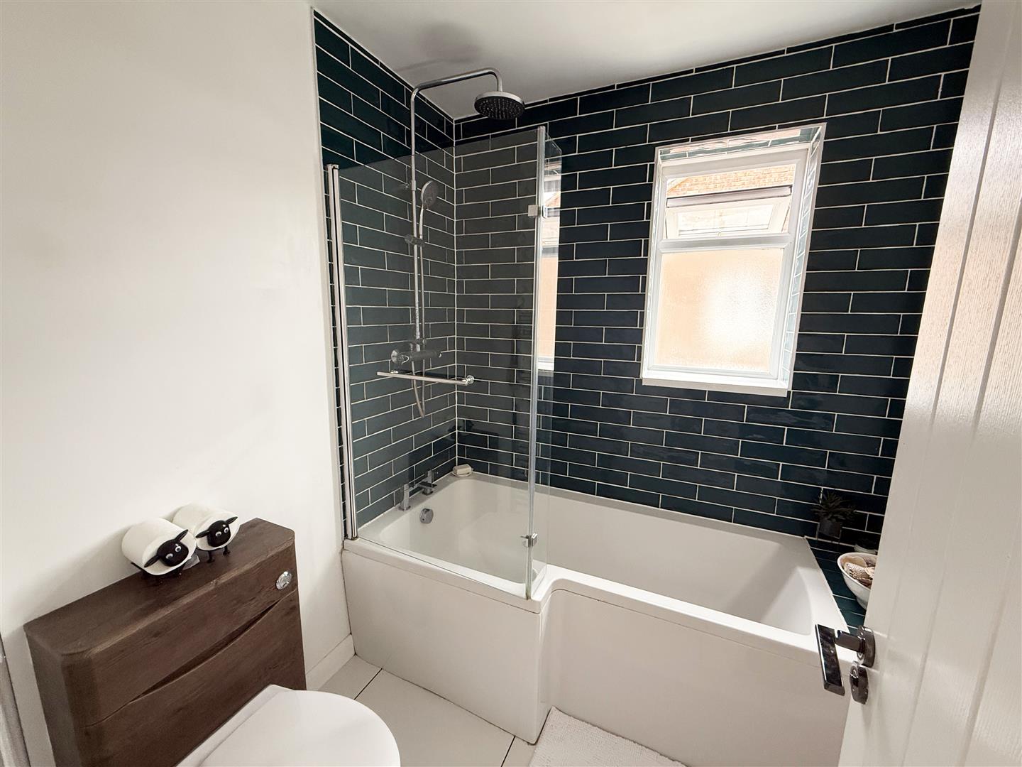 Obscure rear aspect double glazed window. 'P' shaped bath with vanity wash hand basin and close coupled WC. Partially tiled walls and tiled floor.