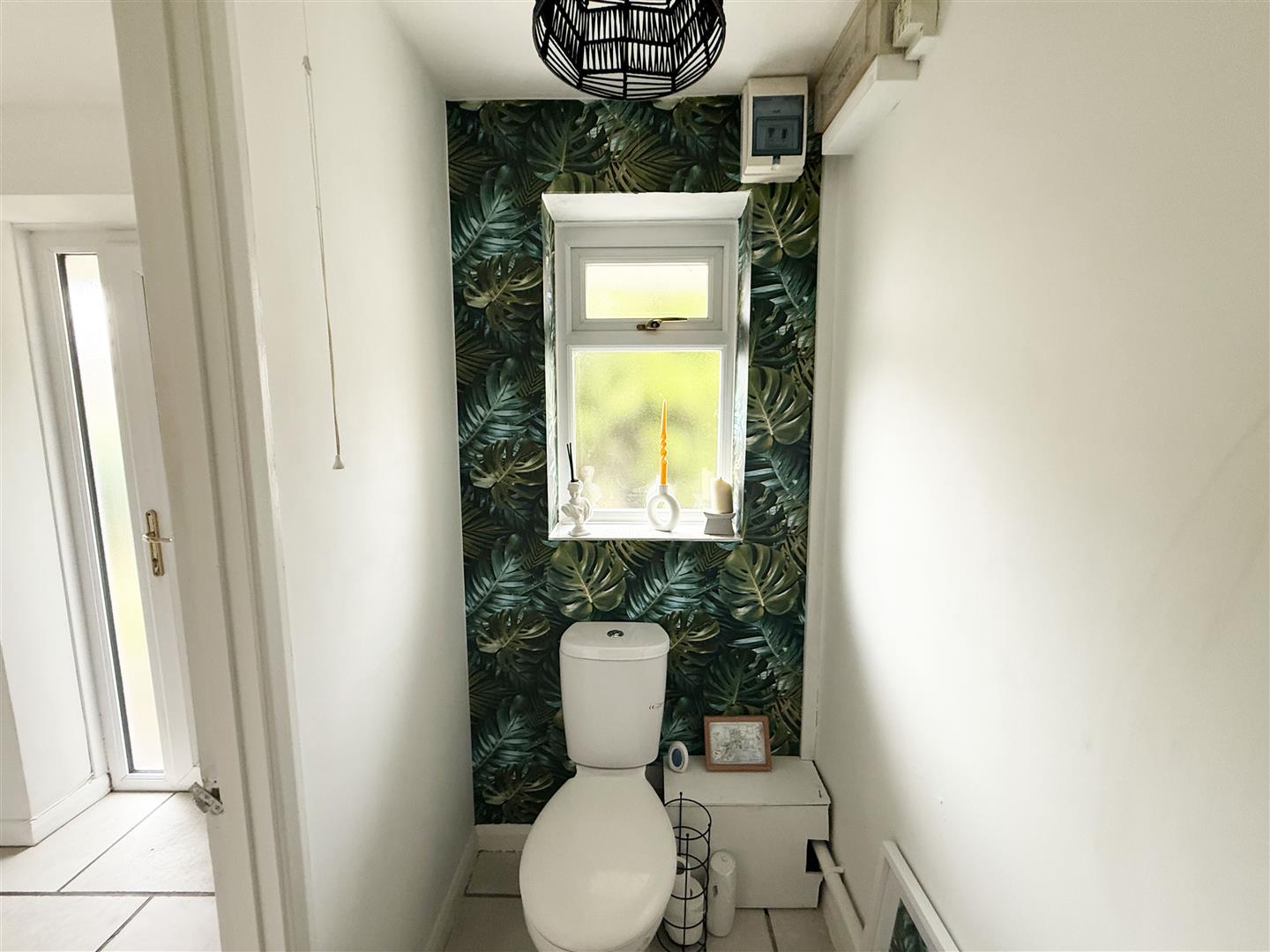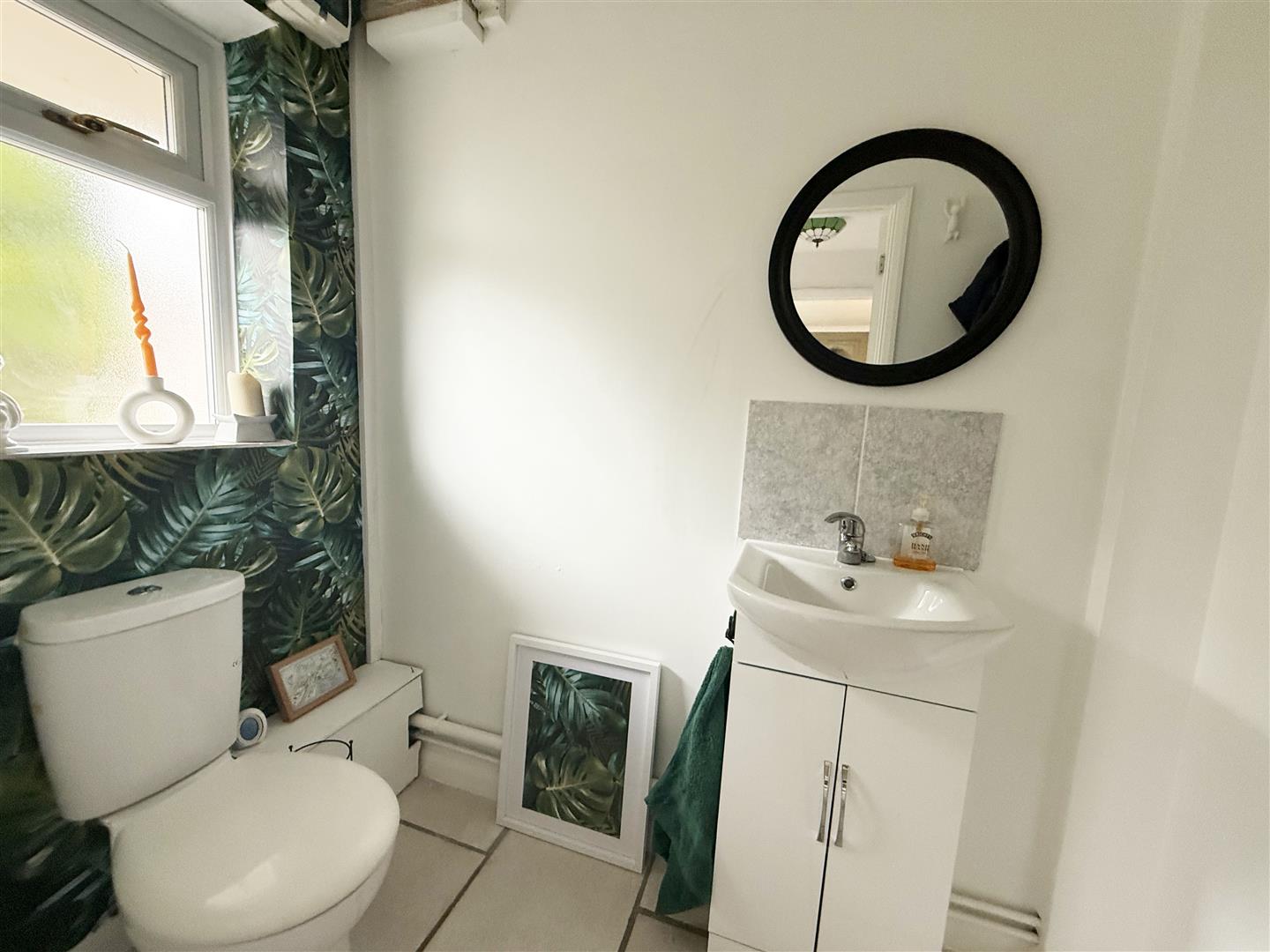 Rear aspect obscure double glazed window. Fitted with a two piece suite comprising vanity wash hand basin