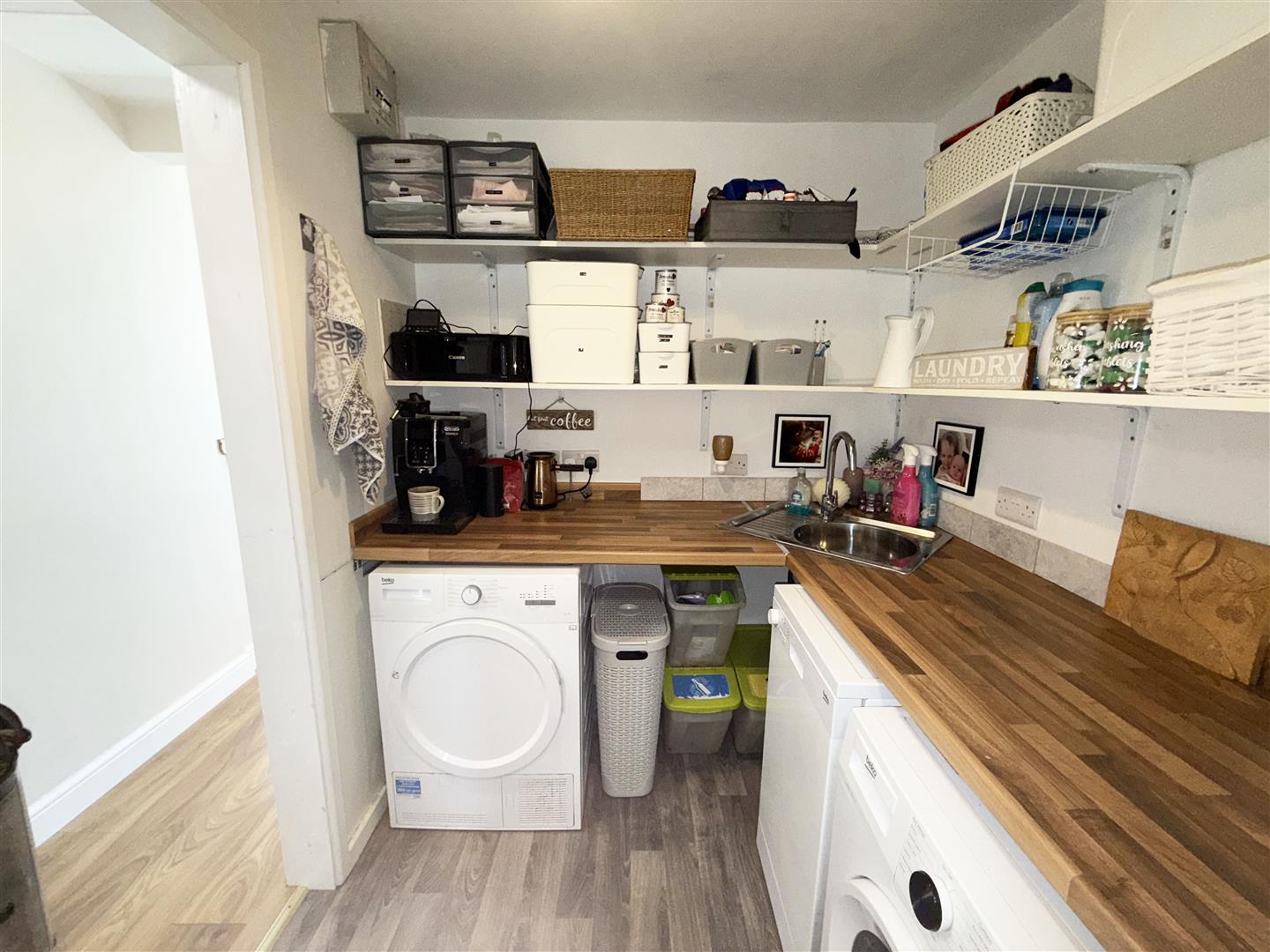 Worksurfaces with space and plumbing beneath for a washing machine. Space for dishwasher, space for additional appliance. Wood effect flooring. Sliding door to: