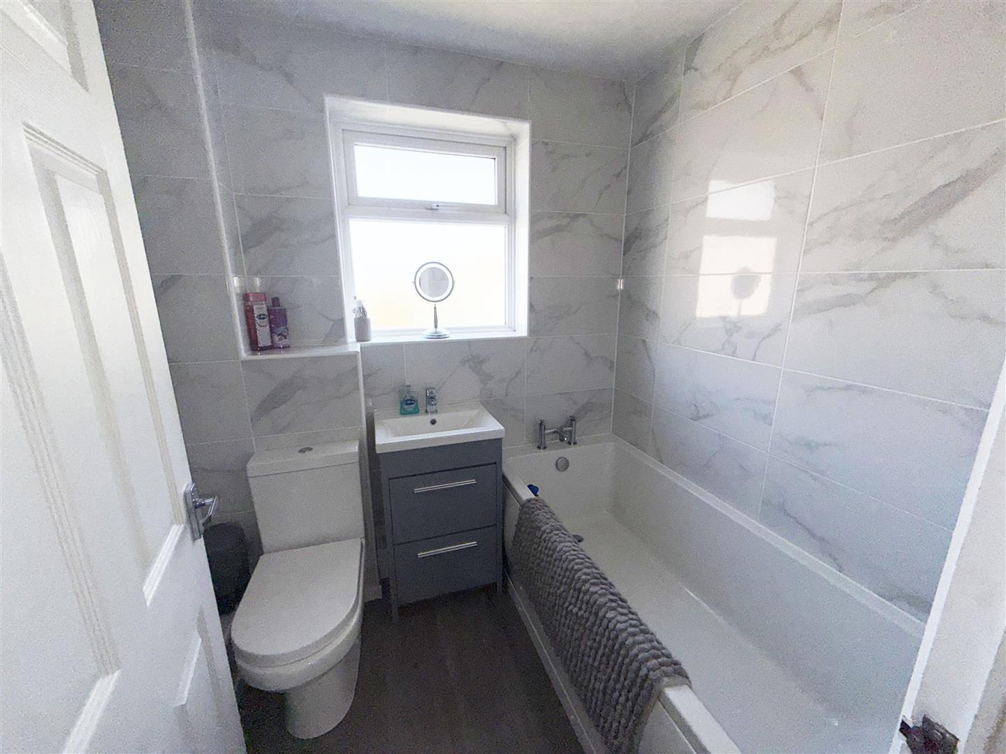 Obscure window to rear aspect. Fitted with a three piece suite comprising panelled bath, vanity wash hand basin and W.C. Tiled walls, wood effect flooring and heated towel rail.
