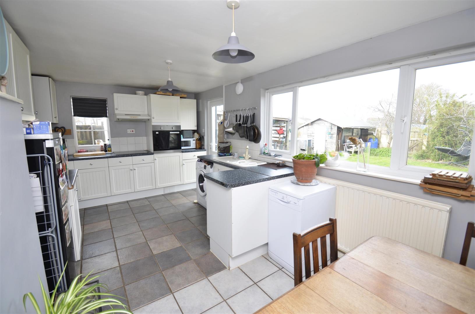 Dual aspect double glazed windows. Fitted with matching wall, base and drawer units with top work surfaces over with sink and drainer unit inset. Integrated oven with electric hob and extractor over. Tiled splashback. Space for fridge/ freezer, space and plumbing for a washing machine. Tiled floor. Radiator. Double glazed door to the garden.