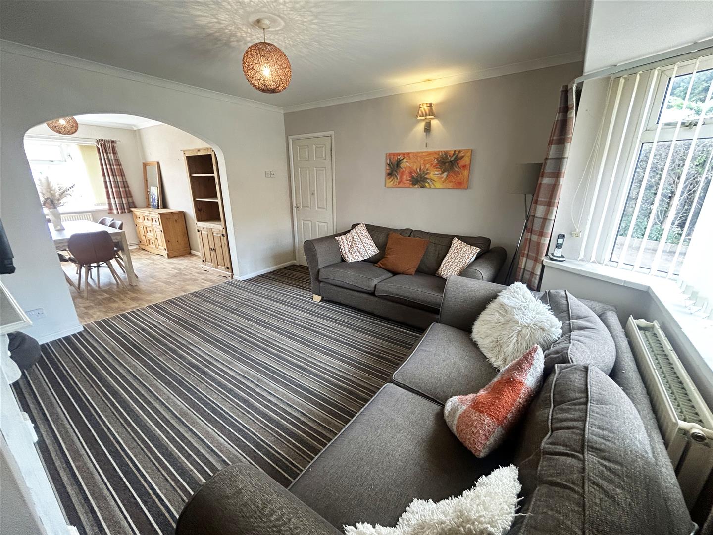 Front aspect bay window. Feature fireplace, radiator, opening to: