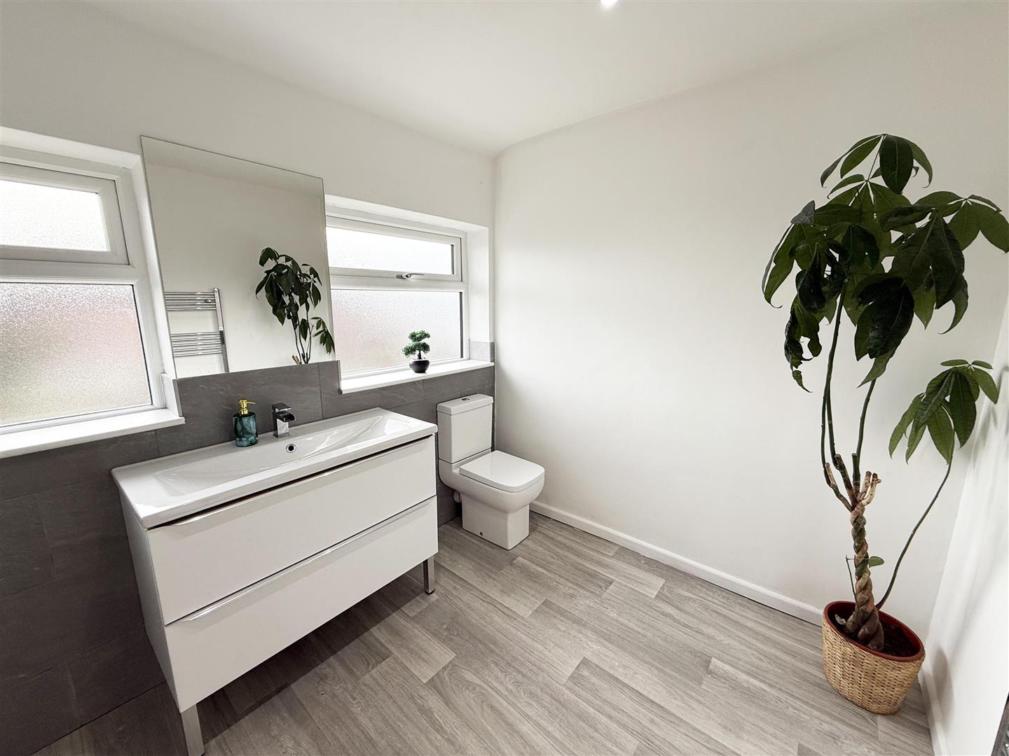 Two double glazed obscure windows to rear aspect. Fitted with a three piece suite comprising panelled bath with shower over and glass screen. Wash hand basin and W.C. Heated towel rail.