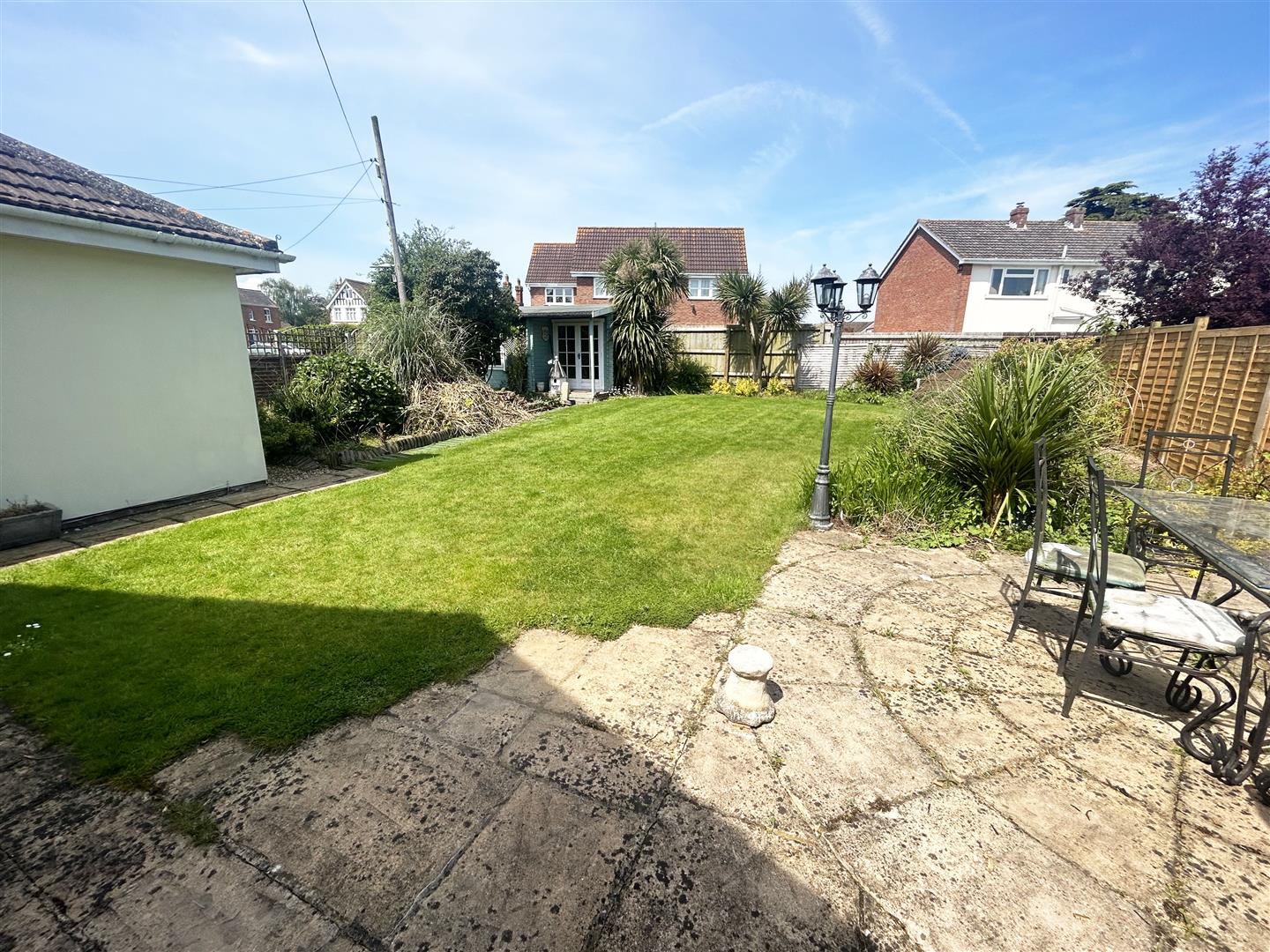 Fully enclosed with timber fencing, timber gate leading to Baymead Lane, timber shed on hardstanding to remain with power and light connected and sink and drainer unit inset. Feature circular patio area, stone chippings surrounding. Outside tap. Pathway leading to: