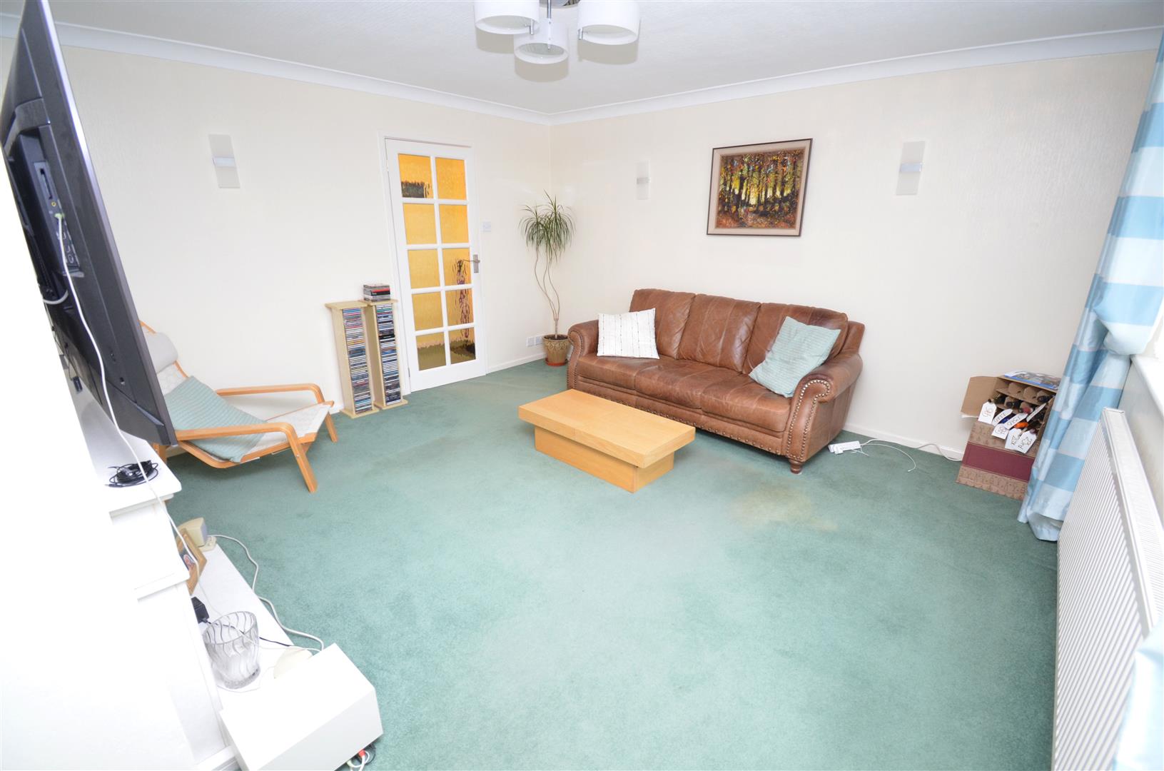 Double glazed window to front aspect. Feature fireplace with electric fire inset. Radiator, coving, glass panelled double doors leading to-