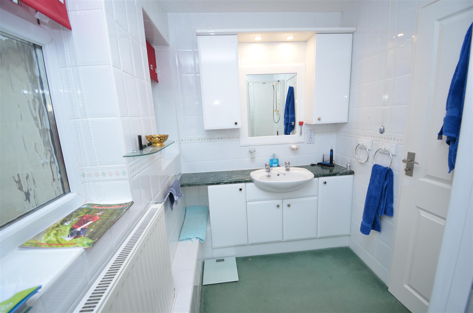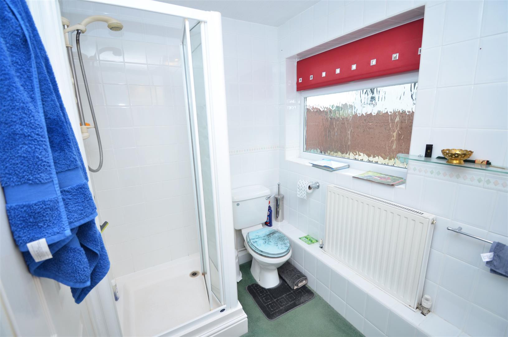 Double glazed obscure window to front aspect. Fitted with a white three piece suite comprising double length shower cubicle, W.C, vanity wash hand basin with built in storage. Radiator, tiled walls.