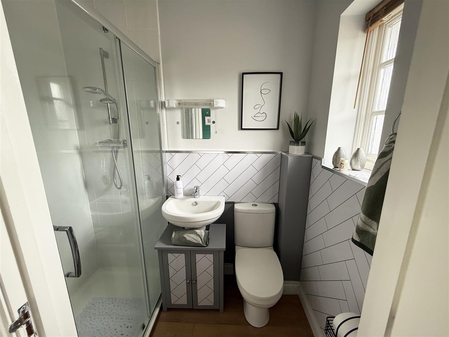 Double glazed window to rear aspect. Fitted with a three piece suite comprising double shower cubicle with mains shower with overhead shower attachment. Wash hand basin and WC. Wooden flooring, Partially tiled walls.
