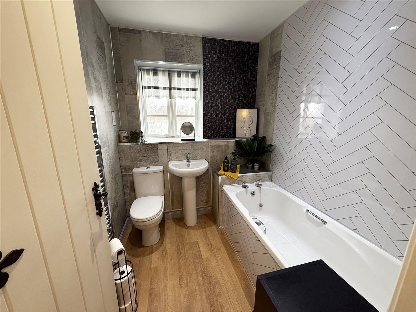 Obscure double glazed window to front aspect. Fitted with a three piece suite comprising bath, wash hand basin and WC. Tiled walls. Wooden flooring, heated towel rail.